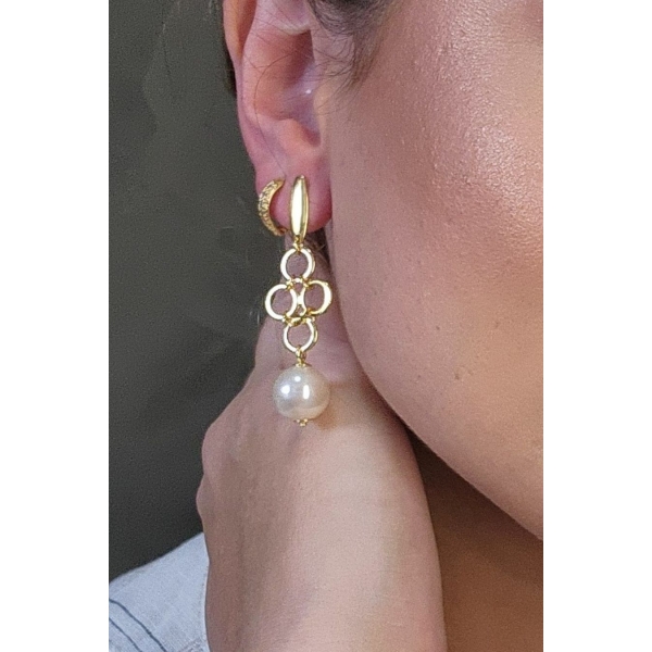 Este brinco grande apresenta um fio com um círculo dourado e uma pérola, banhado em ouro 18k, criando um visual sofisticado e elegante. A combinação de fio, círculo e pérola adiciona um toque de glamour ao seu visual, tornando esta peça ideal para ocasiões especiais. Perfeito para quem busca uma joia refinada e estilosa, este brinco é uma escolha encantadora e sofisticada.