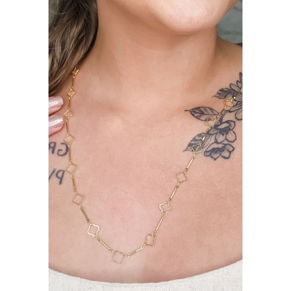 Este colar apresenta uma corrente detalhada com uma delicada flor vazada como pingente. O design romântico e feminino adiciona um toque de elegância ao seu visual, enquanto o banho em ouro 18k confere brilho e durabilidade à peça. Perfeito para uso diário ou para ocasiões especiais, este colar é uma adição encantadora ao seu guarda-roupa.