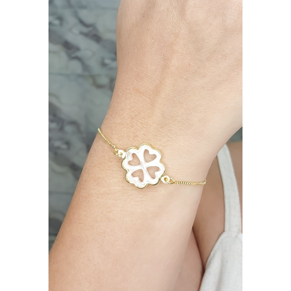 Esta pulseira ajustável apresenta um trevo de quatro folhas feito de madrepérola, simbolizando sorte e beleza. Sua versatilidade e significado fazem dela uma escolha encantadora para complementar uma variedade de looks, do casual ao formal.