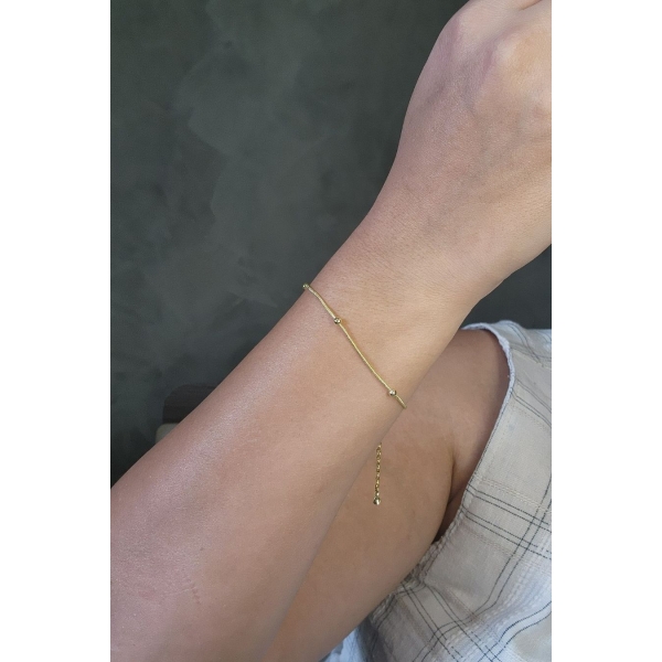 Esta pulseira apresenta uma corrente lisa com bolinhas banhado em Ouro 18 quilates, oferecendo um toque de delicadeza e elegância ao seu visual. Sua versatilidade e beleza fazem dela uma escolha encantadora para complementar uma variedade de looks, do casual ao formal.